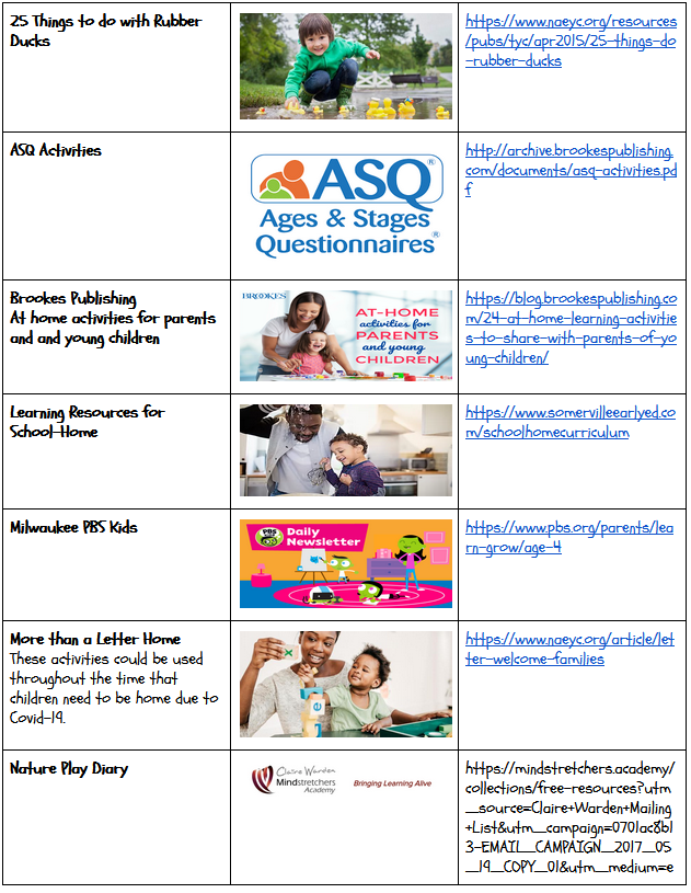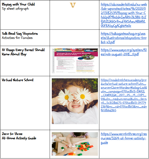 ● Draw a picture (or use a coloring book picture), draw black lines over it, have child cut those lines to create a puzzle ● Make a Snowflake ● Match Plastic Easter Eggs ● Stack plastic cups ● Make a marshmallow and toothpick sculpture ● Paint with plastic forks ● Play with slime ● Make edible playdough out of kool aid ● Make a sensory bin out of rice and small gadgets ● Paint with marbles ● Play a board game ● Play a card game ● Make a card for a family member Learning Games & Activities